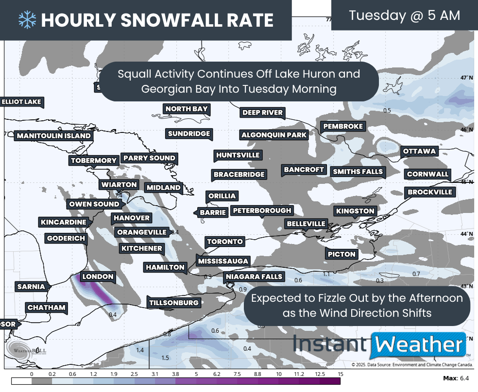 Because of this, some school boards near the lakes may choose to cancel buses proactively, especially where snow squall watches remain in effect. However, confidence in widespread cancellations is lower at this stage since the heaviest lake effect snow isn’t expected to fully develop until later Monday morning or afternoon.