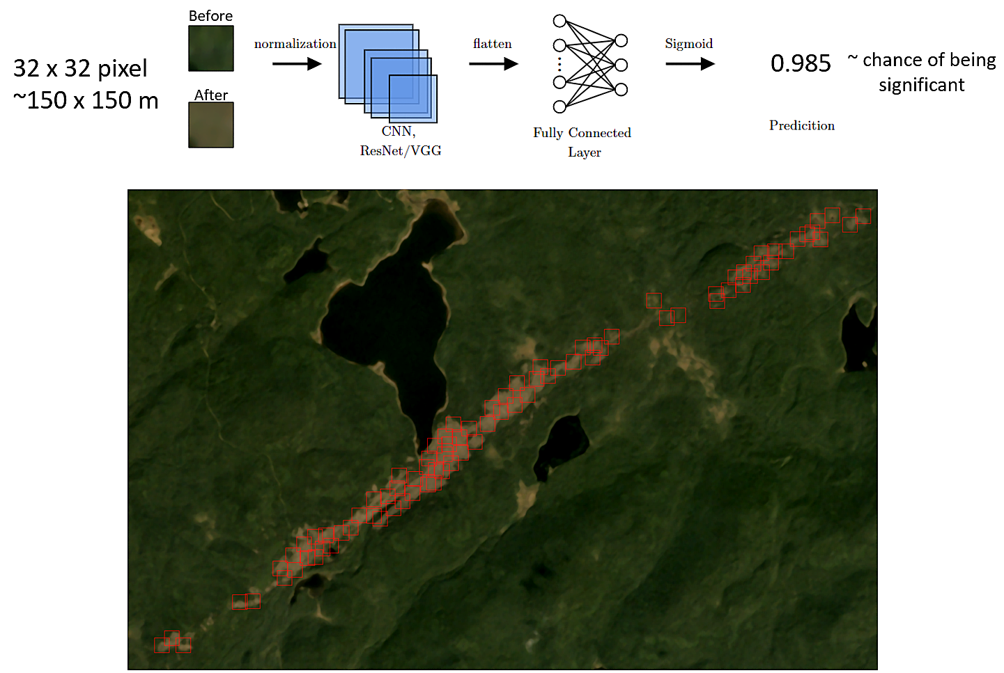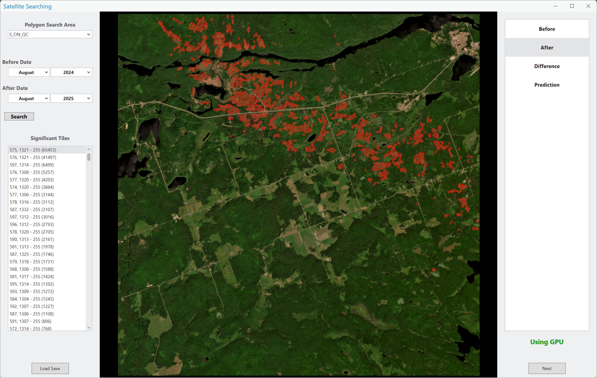 To accelerate the search, NTP researcher Daniel Butt, a PhD candidate in software engineering, developed an AI assisted satellite review tool. The system compares pairs of satellite images taken one year apart (Planet Labs August imagery) and uses machine learning to flag areas where trees have been damaged in a way consistent with tornadoes or downbursts.