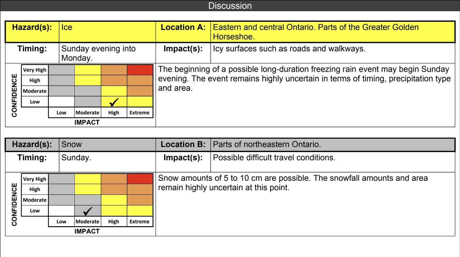 Location A (Ice, 3mm): A potential freezing rain event could glaze roads and walkways across eastern and central Ontario and parts of the Greater Golden Horseshoe. Confidence remains low regarding exact timing, precipitation type, and coverage.