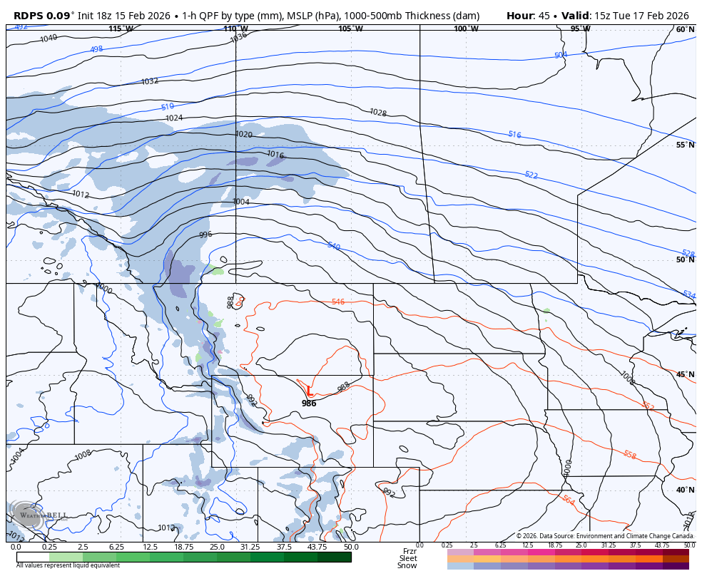The rdps model showing precipitation type and intensity for Monday at 9pm mt. courtesy of WeatherBell.