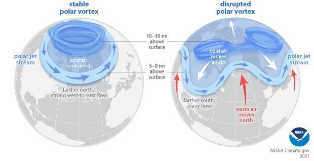 A stable polar vortex vs a disrupted polar vortex. Image courtesy of NOAA.