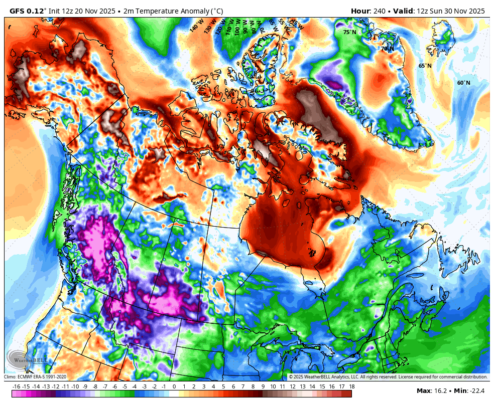 The GFS Model of temperature anomalies (departures from normal) on the morning of November 30th. Image courtesy of WeatherBell.