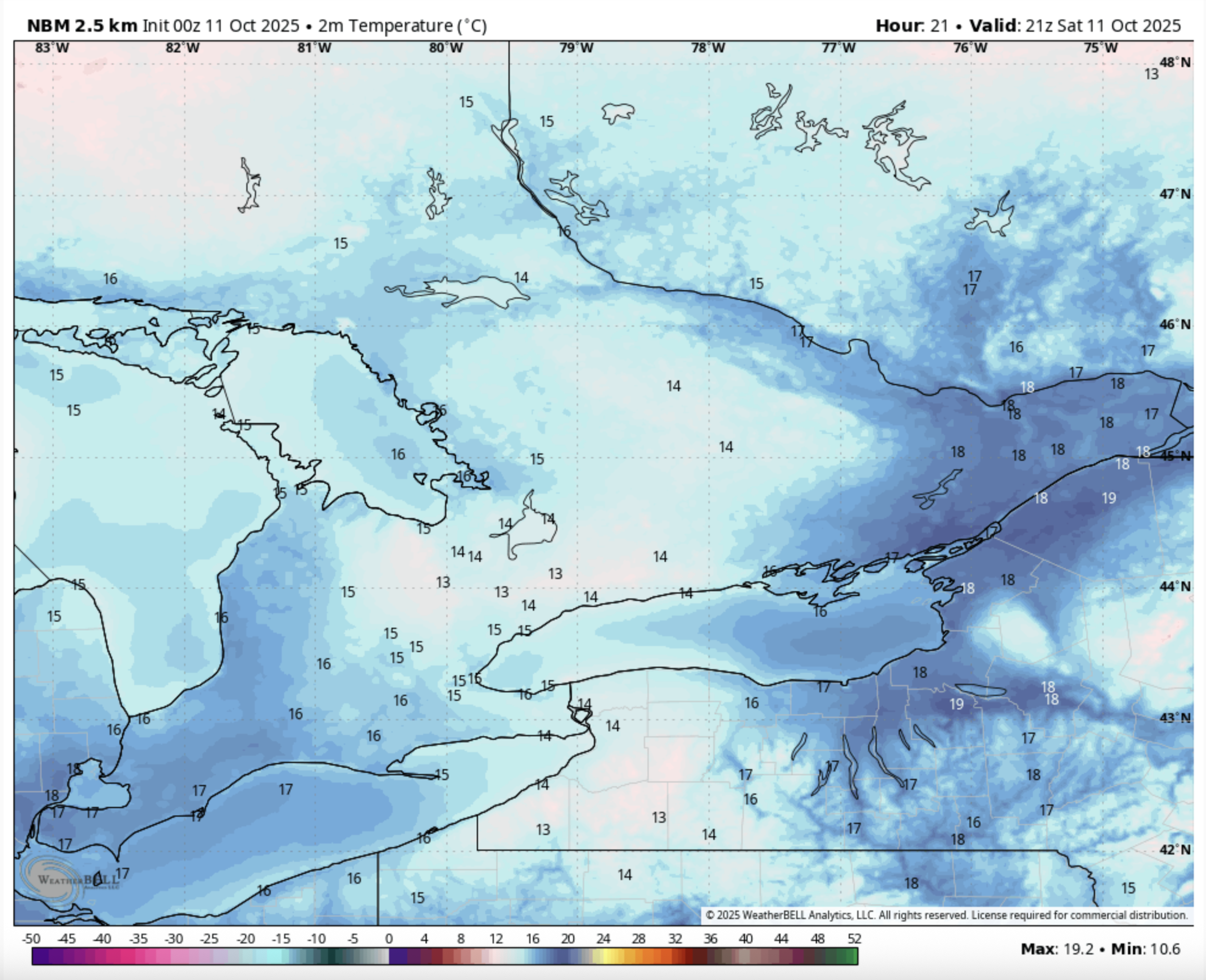On Sunday, slightly warmer air returns. Temperatures will rise into the upper teens, with some areas possibly touching 20°C or a bit higher in parts of Southwestern Ontario. It’ll be a comfortable, mild day overall, great for hiking, apple picking, or those traditional family dinners outside if you’re lucky enough to have a sunny patio.