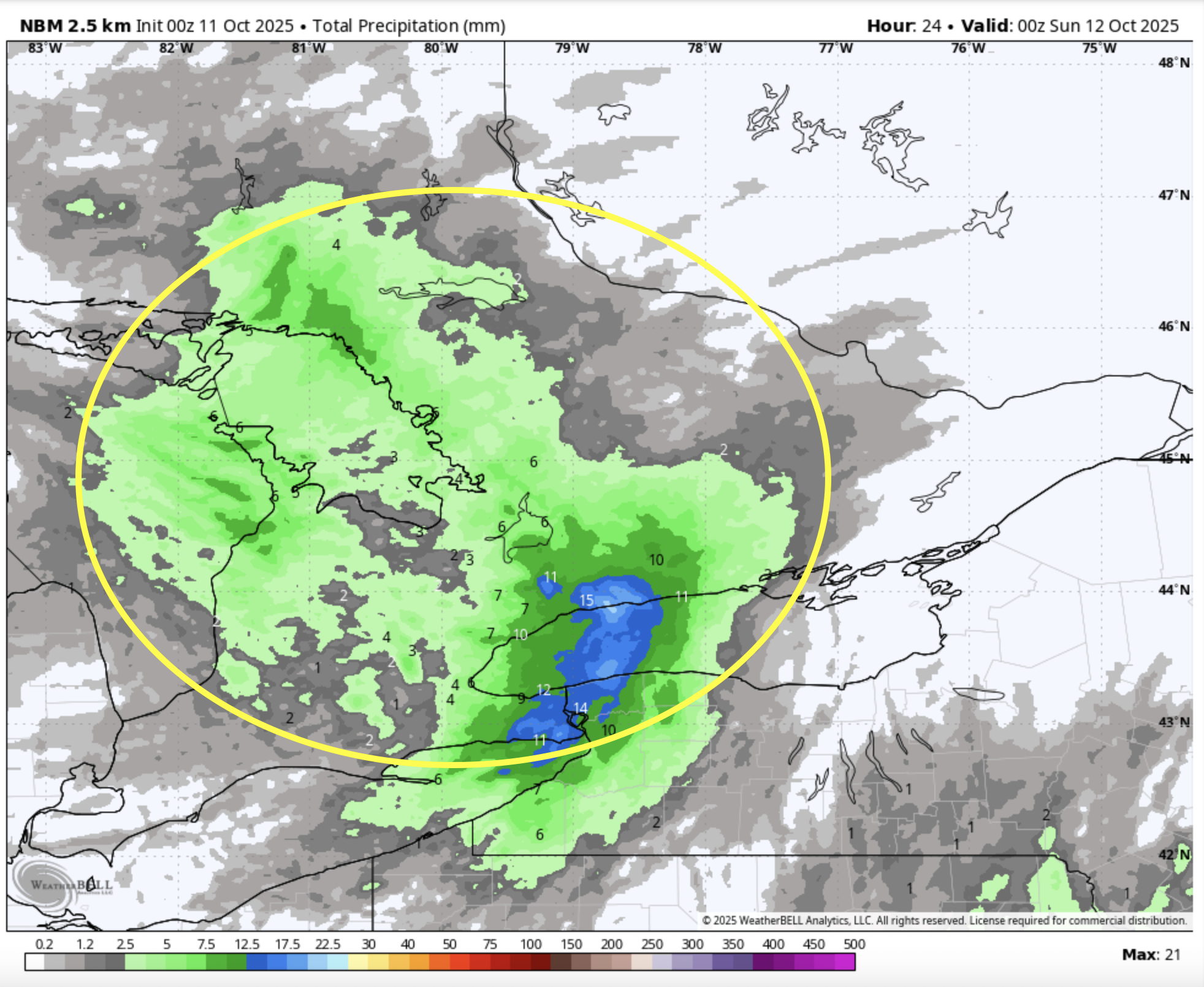 Sunday looks to be the best day of the long weekend. Forecast models show mostly dry and mild weather, perfect for any outdoor Thanksgiving plans or fall colour tours. A few isolated showers could develop in Niagara or Far Eastern Ontario, but these should be brief and light.
