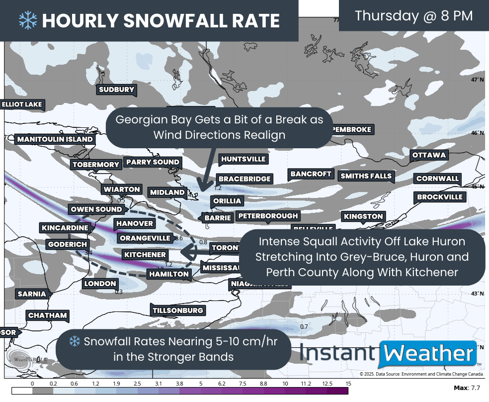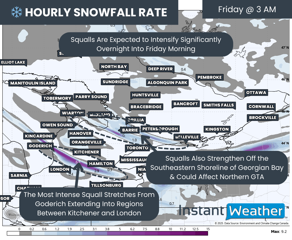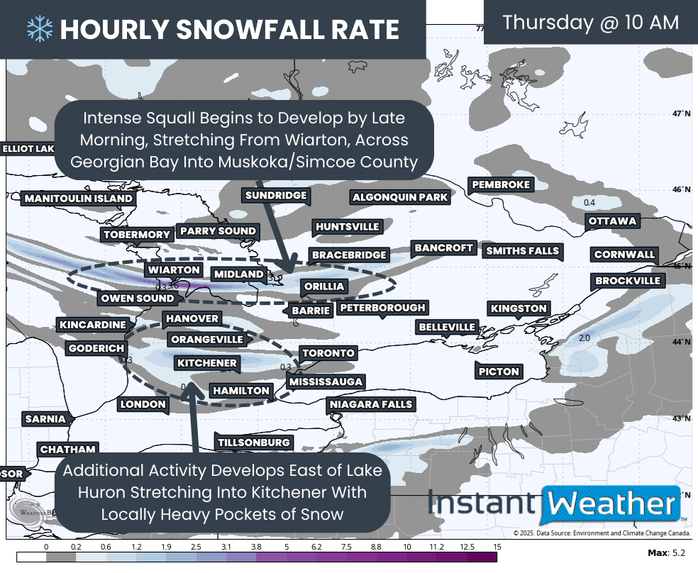 Confidence continues to grow in what is shaping up to be a potentially dangerous snow squall event for regions east of Lake Huron and southeast of Georgian Bay as we wrap up the week.