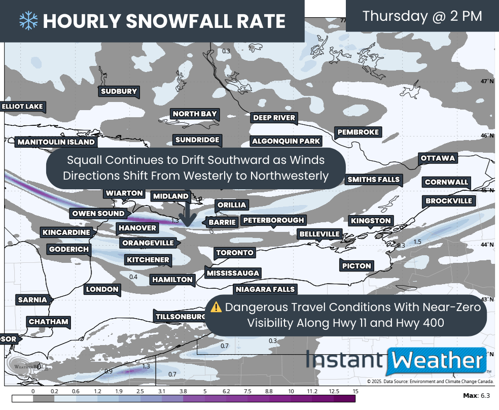 Conditions will worsen significantly into the evening as the squall drifts far enough south to draw its full moisture supply from Lake Huron instead of Georgian Bay. This new orientation will allow the band to tap into a longer stretch of open water, which increases its intensity.