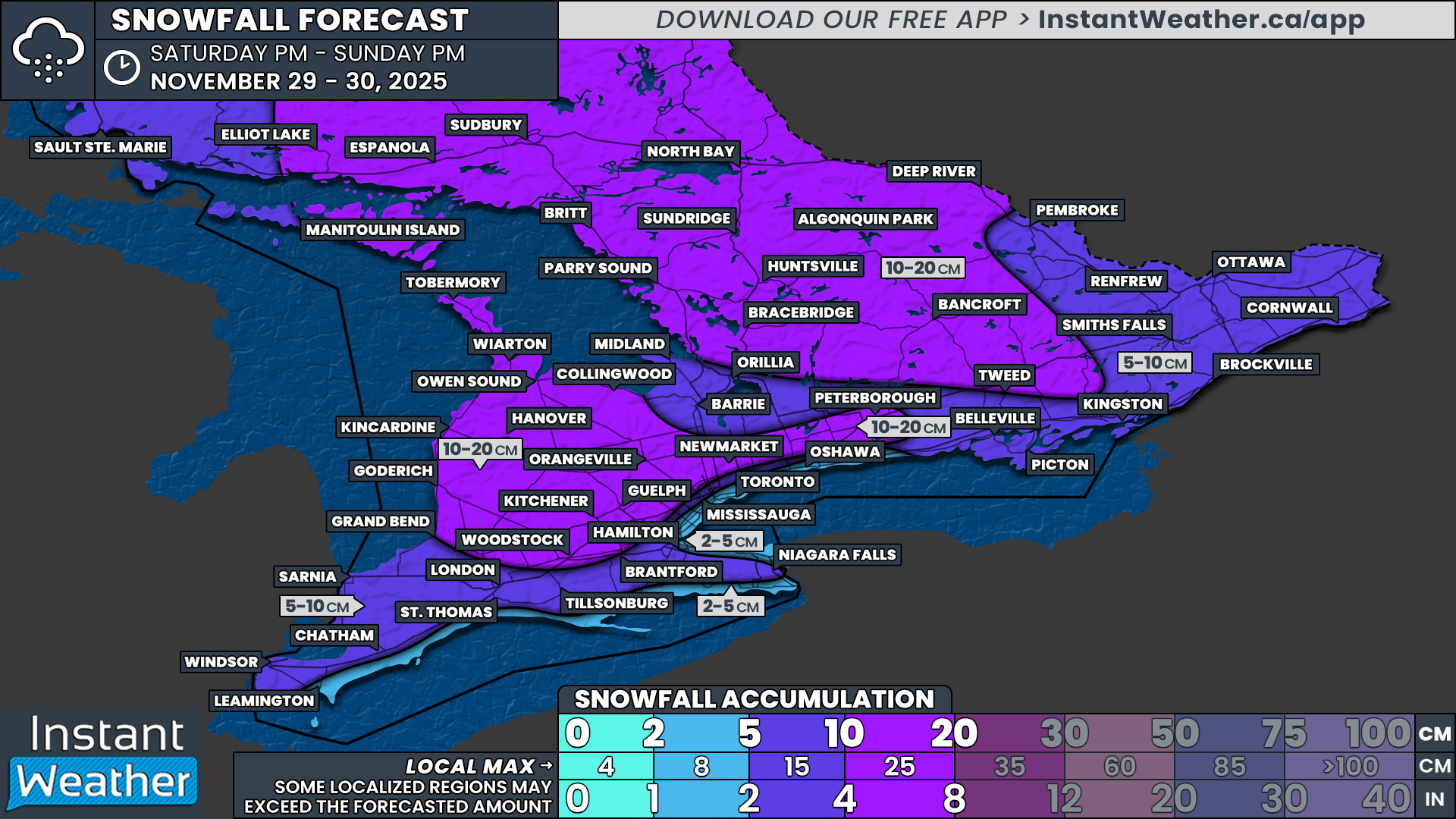 These regions will see more sustained below freezing temperatures throughout the event, along with lake effect enhancement late Sunday. With this, we are looking at around 10 to 20cm, with locally up to 25cm possible in the heavier lake effect pockets.