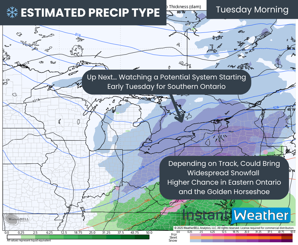 As we look into next week, we are closely watching another potential system that could have an impact on Southern Ontario throughout the day on Tuesday. There is still some uncertainty on the exact track, with the latest model runs shifting it slightly further north, which would increase impacts across a wider portion of the region. However, it could easily shift back south.