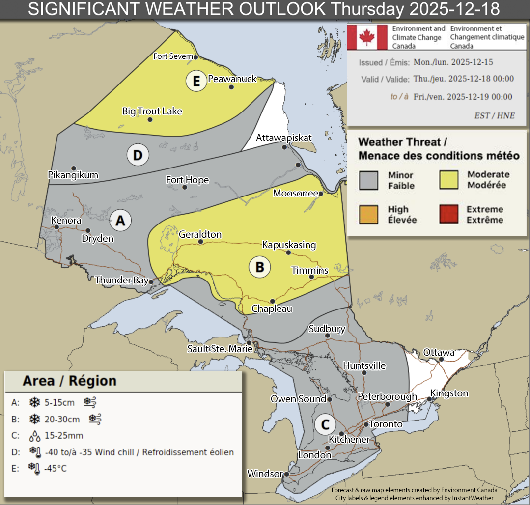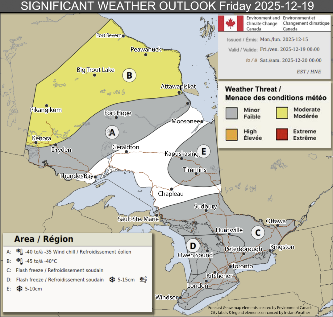 - Extreme wind chills of -40 to -45°C persist across northwestern and far northern Ontario.