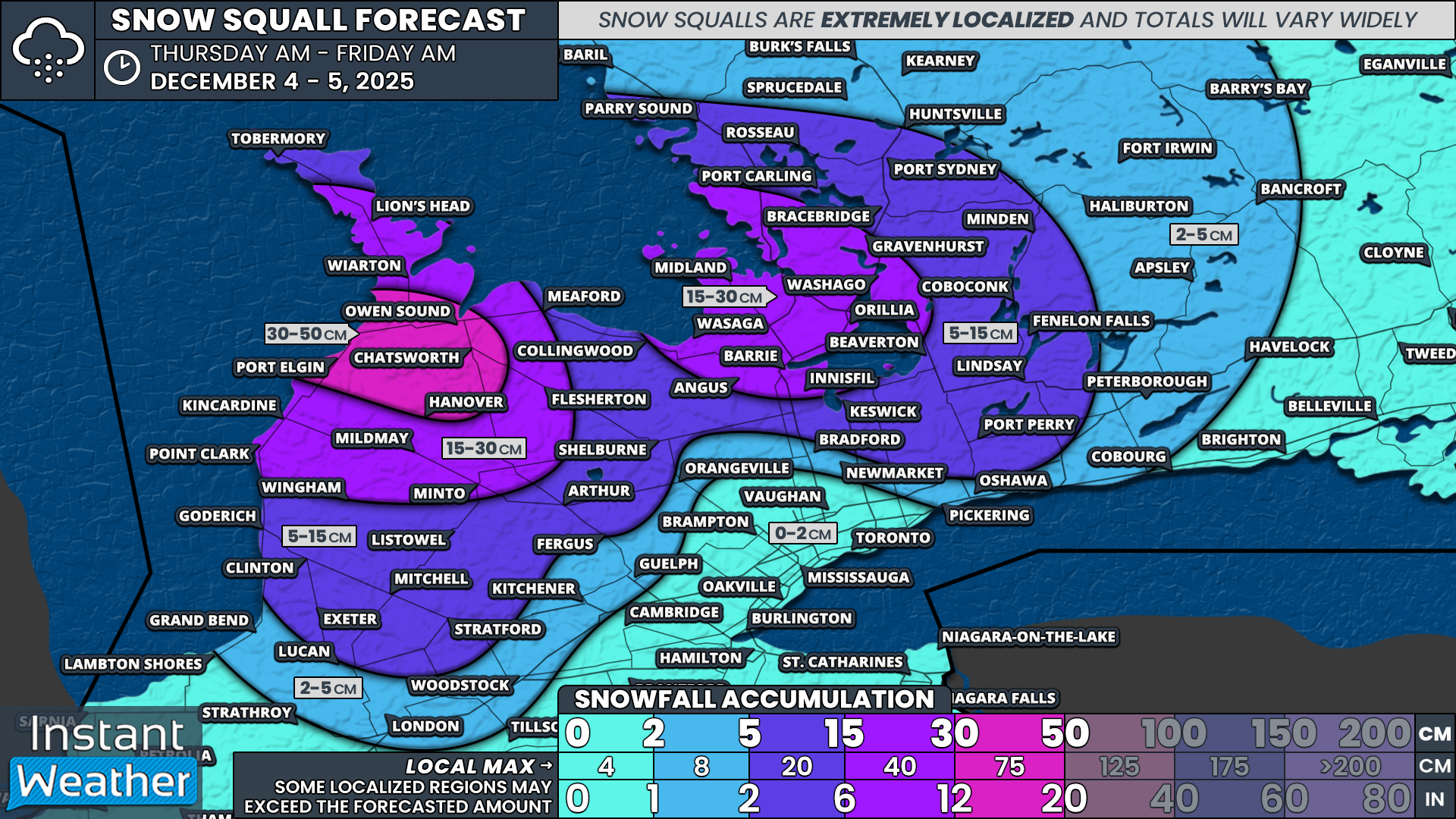 Snowfall totals will vary widely due to ongoing uncertainty about the exact placement and duration of the bands. Confidence is highest that the Lake Huron squall will remain more focused compared to the Georgian Bay band.