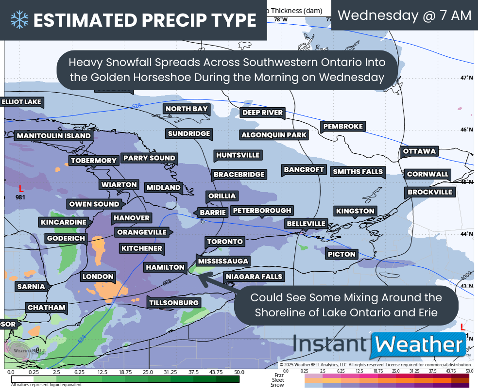 Some wet snow or even rain may mix in along the Lake Ontario and Erie shorelines which could suppress totals around the GTA and Niagara region.
