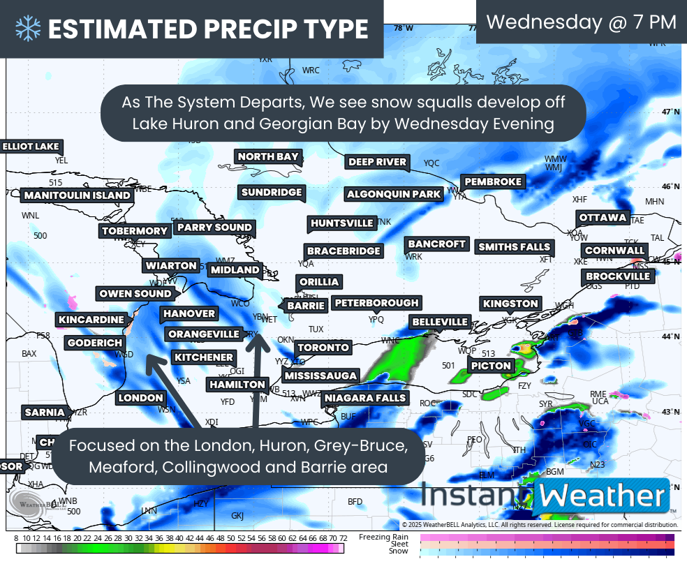 Ahead of it, we may see a few hours of heavy snow squalls develop northeast of Georgian Bay and Lake Ontario. This could bring brief but heavy snow to areas like Parry Sound, Muskoka and Kingston.