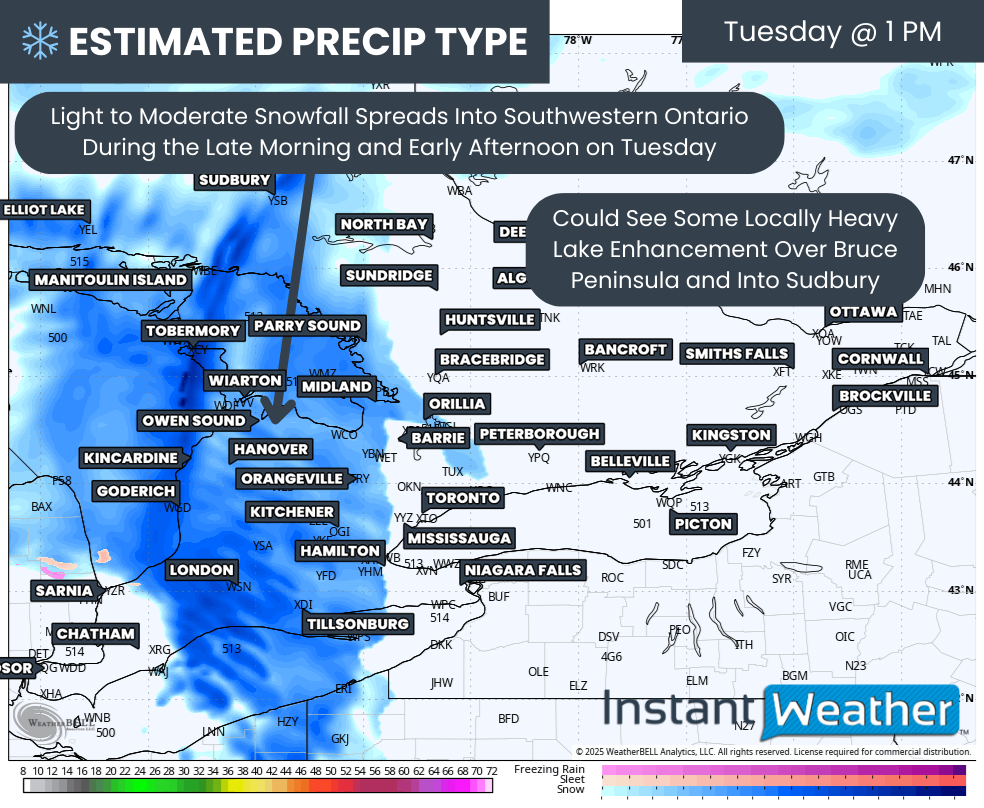 Things will begin to kick off late Tuesday morning into early Tuesday afternoon as precipitation from our first clipper enters from the west. Widespread light to moderate snow will spread across Southwestern Ontario, the Lake Huron shoreline and into portions of Central Ontario and the GTA.
