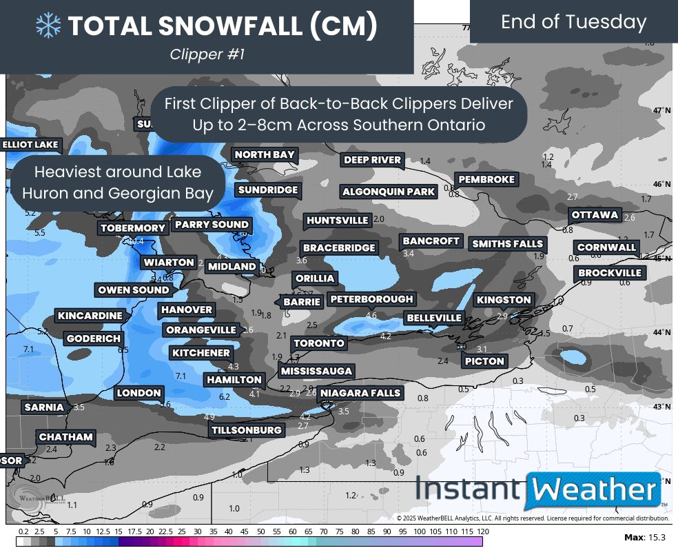 By the time the second clipper wraps up late Wednesday, combined snowfall totals are expected to range from 10 to 20cm across a wide swath of Central, Eastern and Southwestern Ontario. Localized totals up to 25cm cannot be ruled out, especially if there is some lake enhancement.