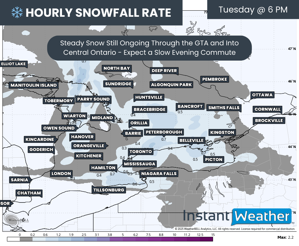 The heaviest snowfall rates will not last long for Southwestern Ontario and the GTA as the 1+cm per hour rates shift into Central and Eastern Ontario by late morning.