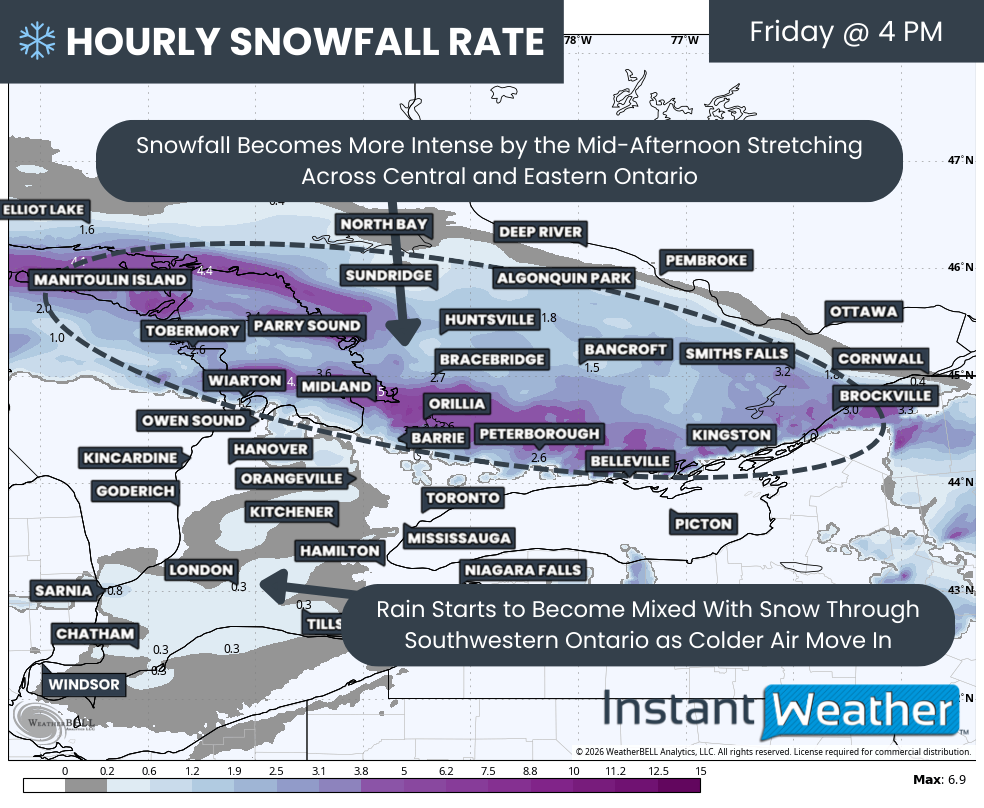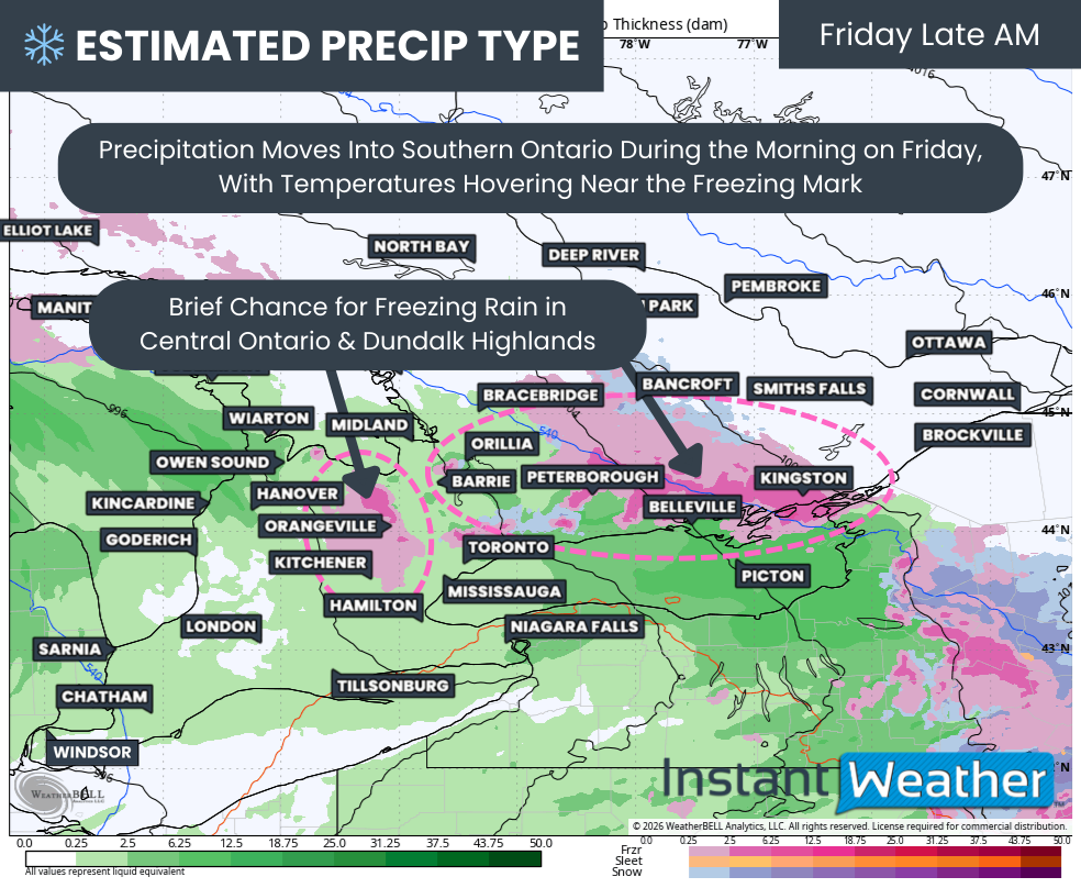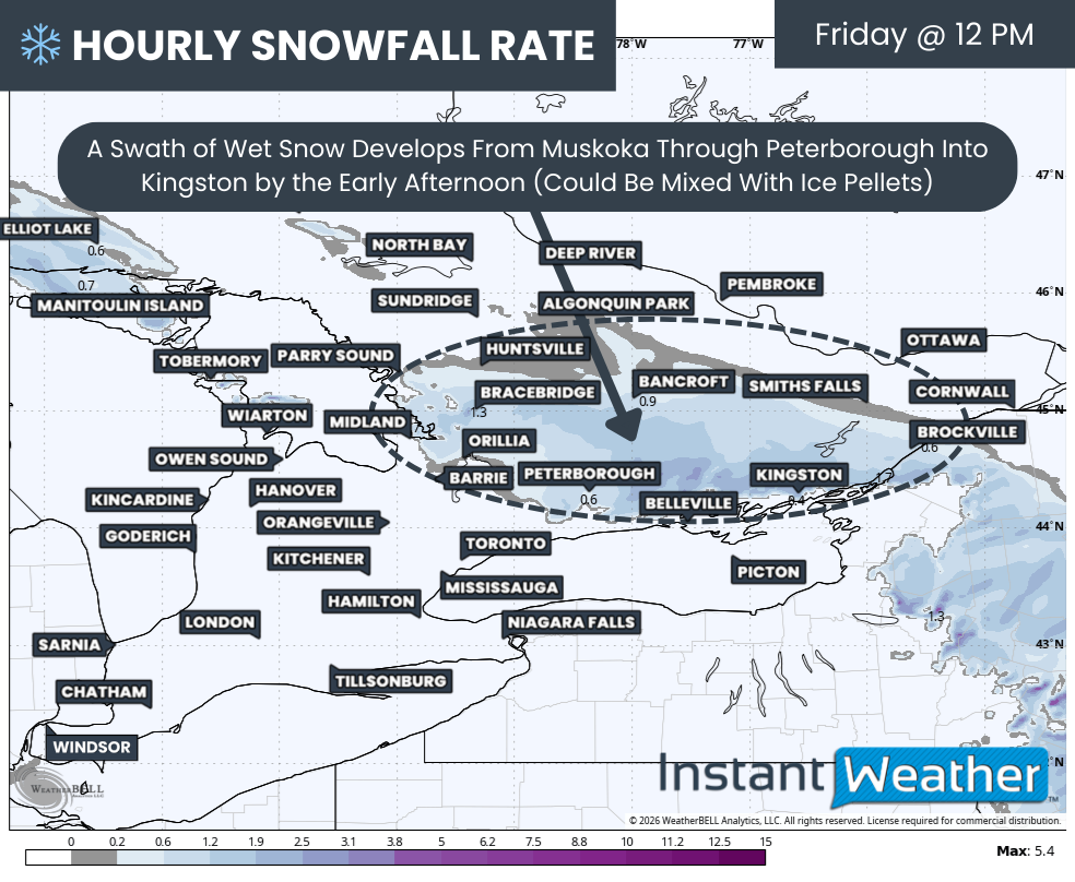 What does appear more certain is that colder air will remain firmly in place across northern sections of Central and Eastern Ontario throughout the day. That means once precipitation begins early Friday afternoon in those areas, it should fall predominantly as snow.