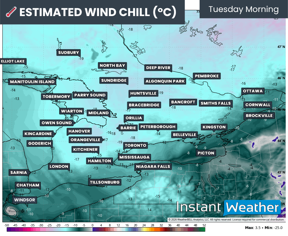 It will pale in comparison to the cold we dealt with earlier this year, but it may feel more brutal after many areas hit 20°C just a few days ago. Now, we’re looking at temperatures between -5°C and -10°C to start the day on Tuesday. Factoring in the wind chill, many areas will feel into the negative double digits, with parts of Central and Northeastern Ontario ranging from -15°C to -20°C Tuesday morning.