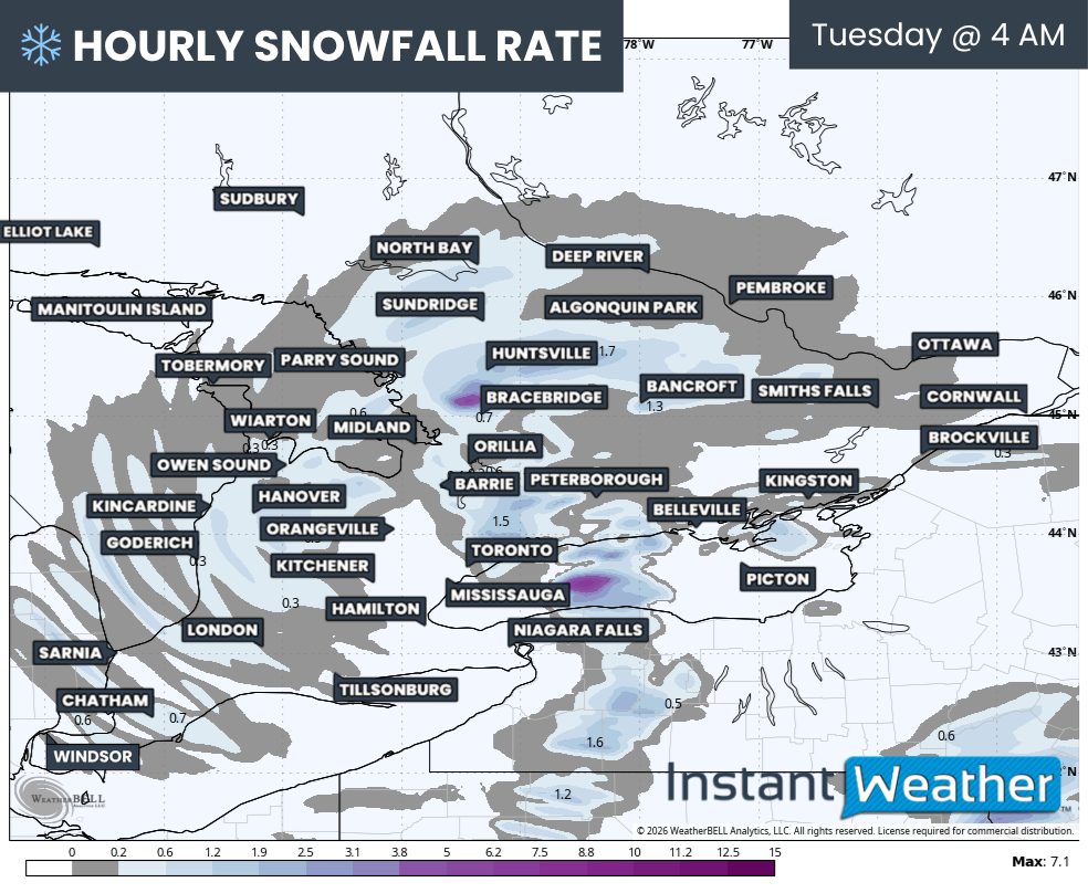 The heaviest pockets of snow appear likely to track from Muskoka through Peterborough and into the Kingston corridor. This could lead to rapid accumulation if temperatures are cold enough to limit melting. Expect poor driving conditions overnight and early Tuesday morning in this area, with sudden whiteout conditions possible.