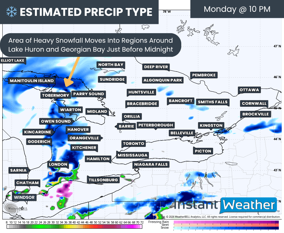 An area of heavier snow is expected to track into regions around Lake Huron and into Northeastern Ontario sometime during Monday evening. This could start as a rain and snow mix with temperatures still near freezing, especially near Lake Erie and Deep Southwestern Ontario, but should switch over to snow later in the evening.