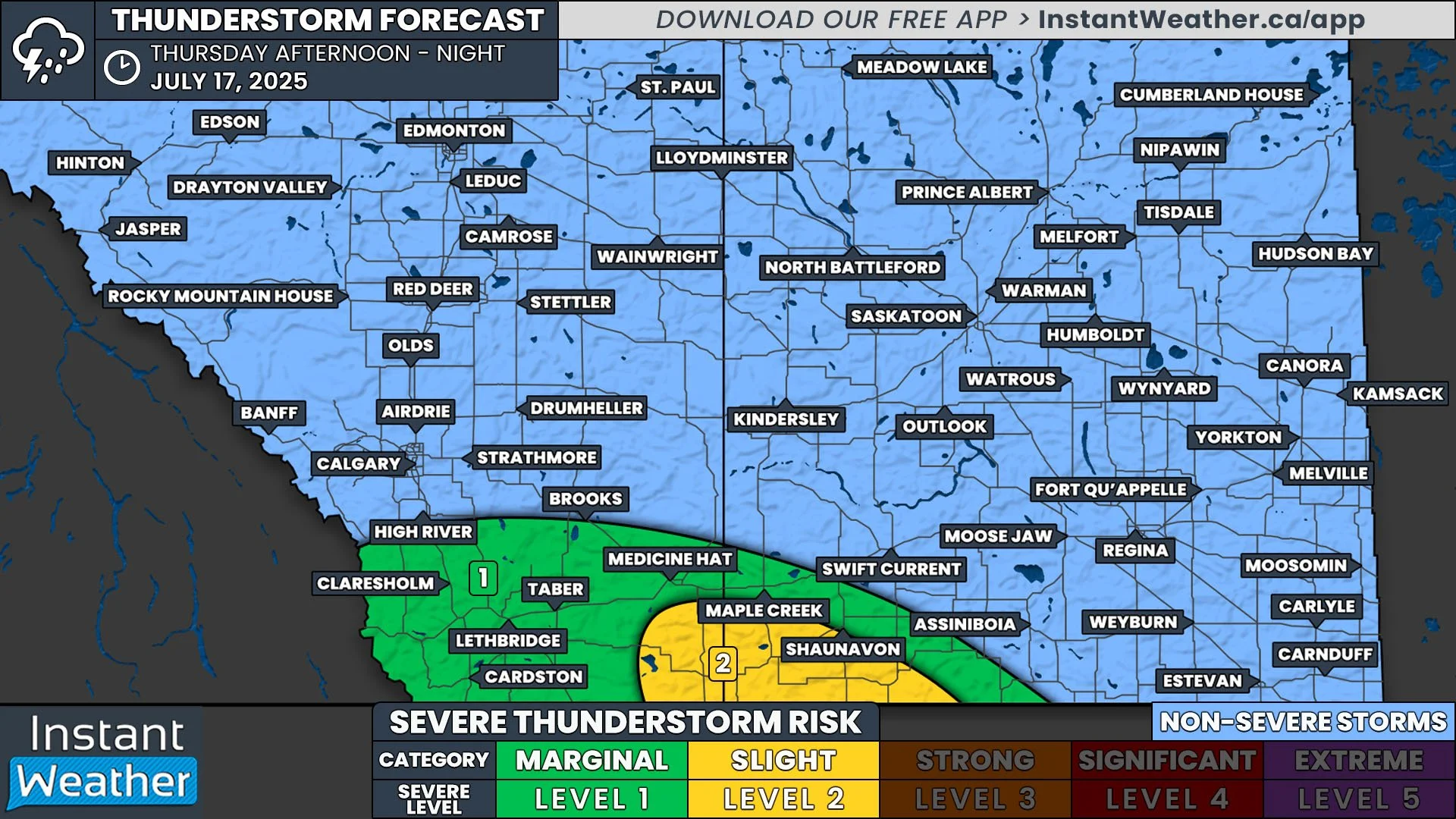 /Despite some cooler temperatures still sticking around, severe thunderstorms are likely today in Southern Alberta and into Southwestern Saskatchewan.