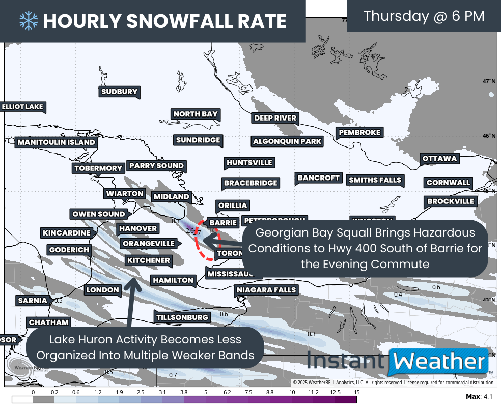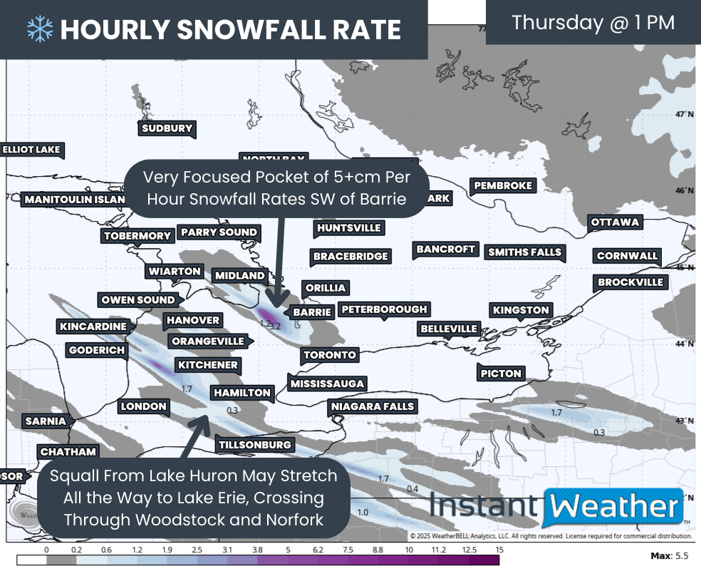 Conditions are expected to deteriorate further into the afternoon. The Georgian Bay squall appears to strengthen with hourly snowfall rates easily exceeding 5cm and possibly pushing 10cm. At this point, the most intense pocket is shown just southwest of Barrie, with Angus being hit hardest.