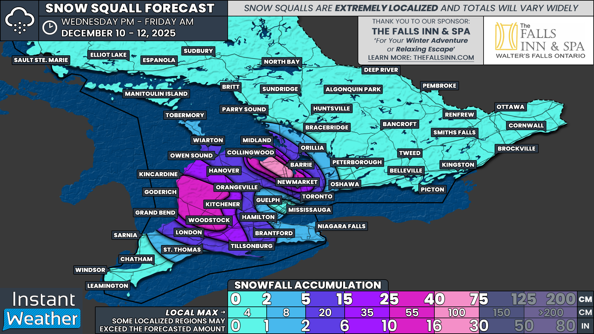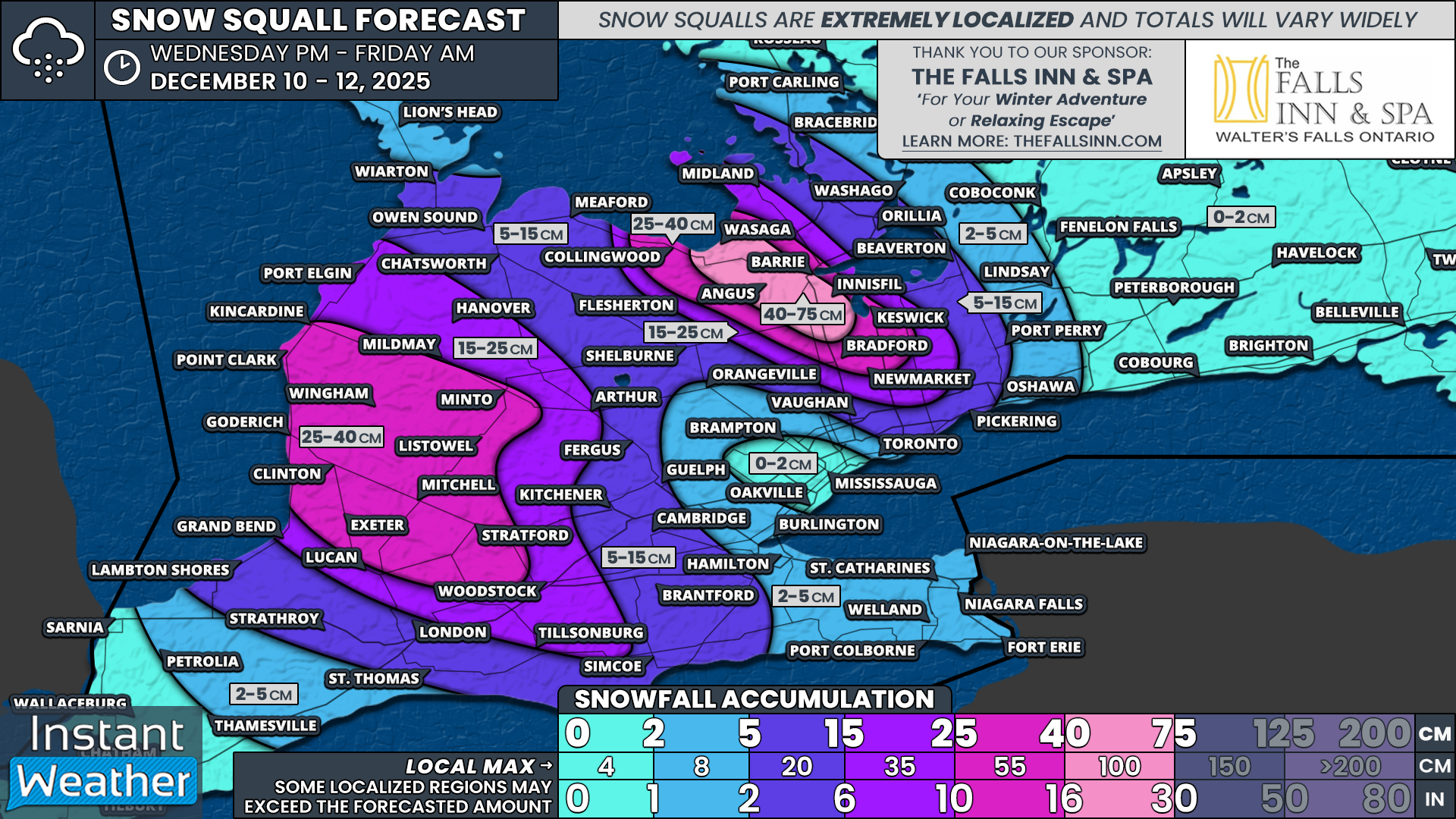 East of Lake Huron including Kincardine, Minto, Point Clark, Wingham, Listowel, Mitchell, Stratford, Exeter and Goderich, totals of 25 to 40cm are expected. Localized amounts up to 55cm are possible if a squall locks in place for several hours.