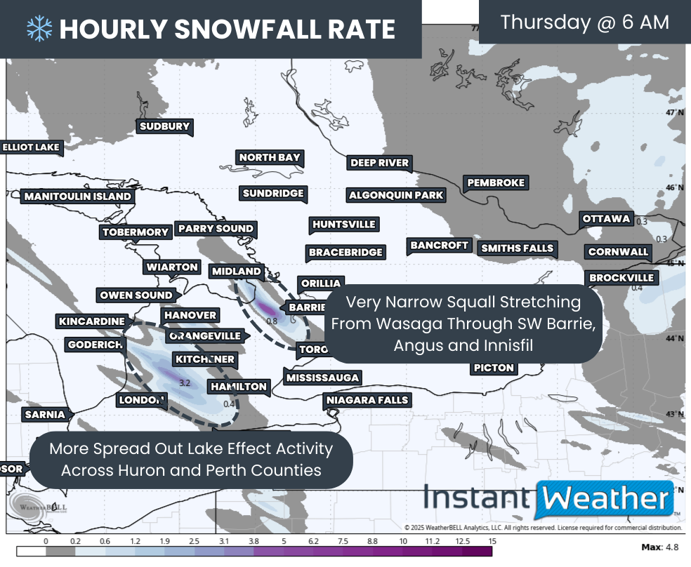 By early morning, we expect the most focused squalls to target the Goderich to London corridor off Lake Huron and the Collingwood to Bradford stretch off Georgian Bay.
