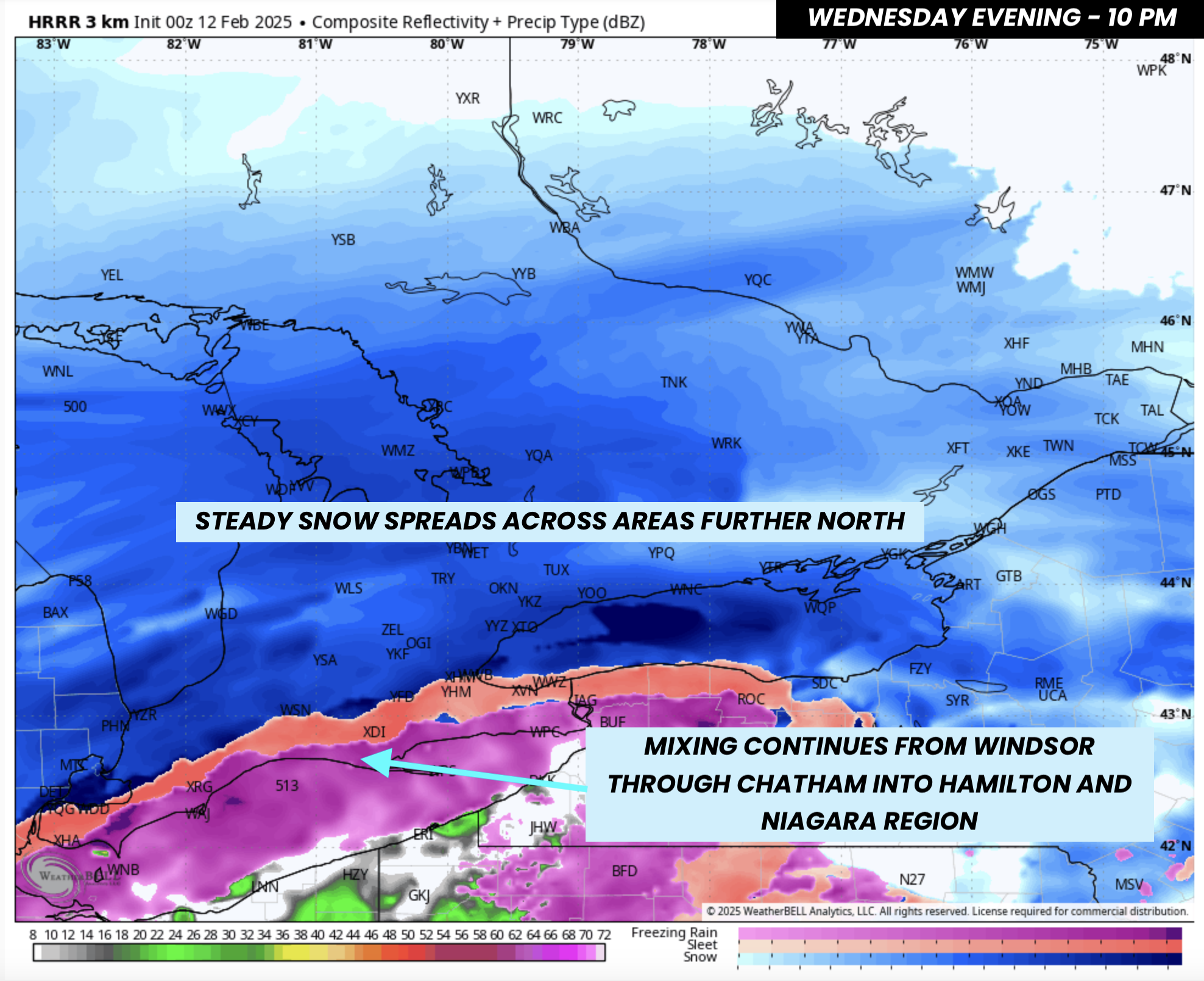Across Southwestern Ontario and into the Golden Horseshoe, the story will look a little different. Precipitation is expected to arrive overnight in the southwest first, spreading northeast through the morning hours.