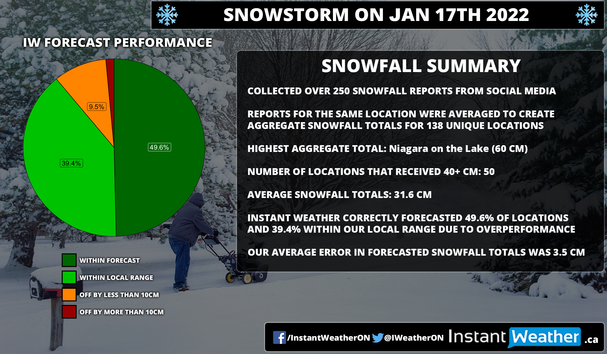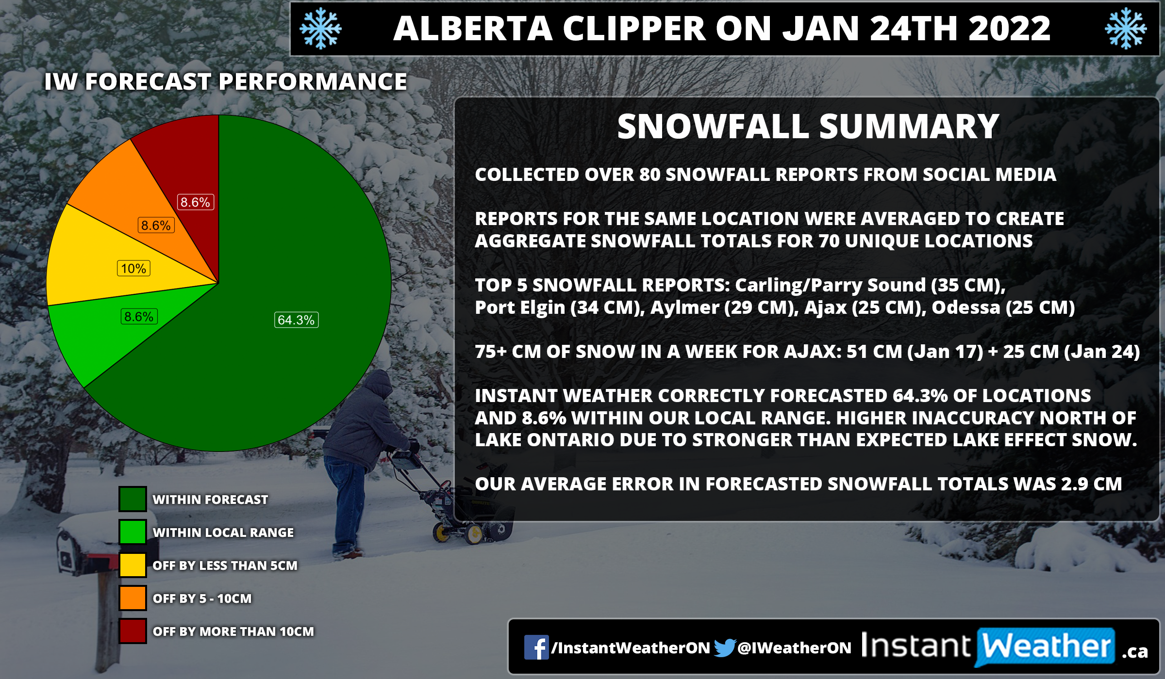 At Instant Weather, our goal is to provide everyone with accessible and reliable weather forecasts. As part of our commitment to accountability and transparency, we collect snowfall data after every widespread snowfall event of 10cm or more across Southern Ontario. The data collected is used to evaluate our forecast and determine how we can make our forecasts more accurate.