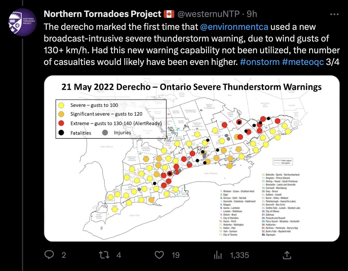 The May 2022 derecho also marked the first time that Environment Canada used a new broadcast-intrusive through the AlertReady system to deliver a severe thunderstorm warning due to wind gusts exceeding 130 km/h. This new warning capability was crucial in mitigating the number of casualties, which could have been even higher had the new system not been utilized.
