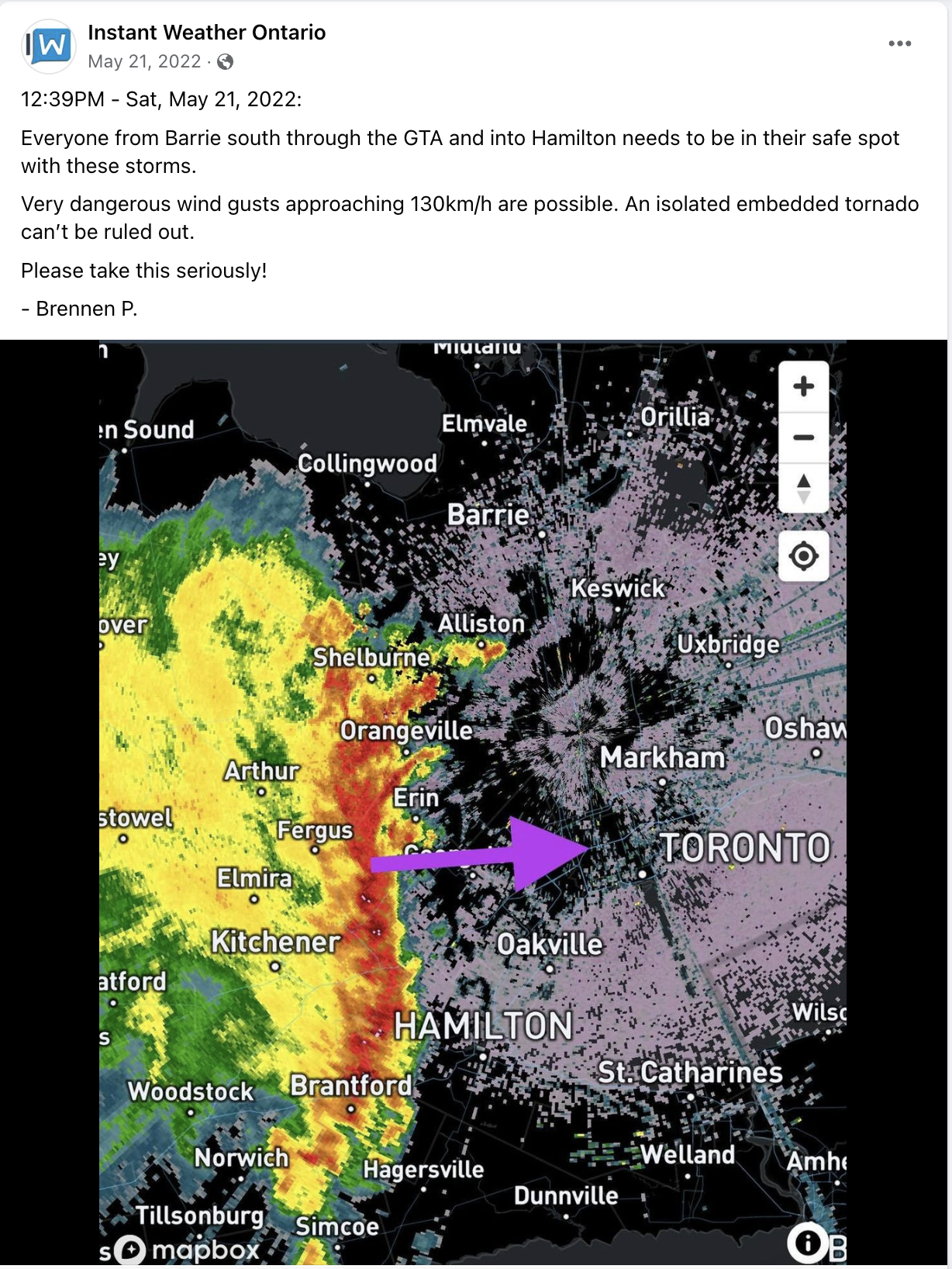 This radar scan at 9:59 AM from the King City radar as shown on IW Pro provided an early indication of potential tornado activity to the northwest of Caledonia. This rotation eventually materialized into the confirmed tornado, which touched down approximately 15 minutes later northeast of Caledonia.