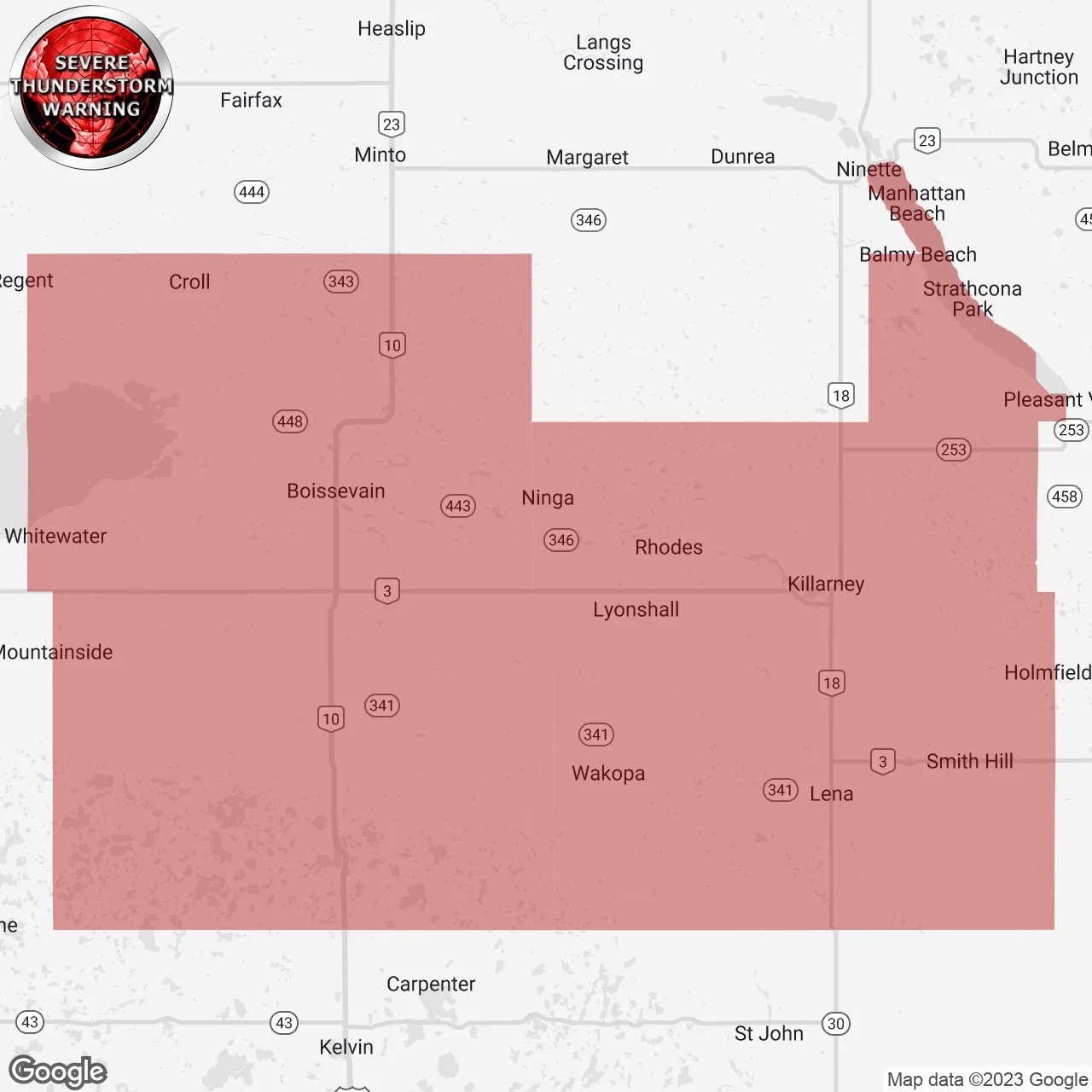 At 9:11 PM, Environment Canada continued the Severe Thunderstorm Warning which mentioned “Environment Canada meteorologists are tracking a severe thunderstorm capable of producing loonie-sized hail and wind gusts in excess of 90 km/h. At 9:10 P.M. CDT doppler radar indicated that this severe thunderstorm was located South of Deloraine and Turtle Mountain Provincial Park and was moving toward the Northeast at 40 km/h.”